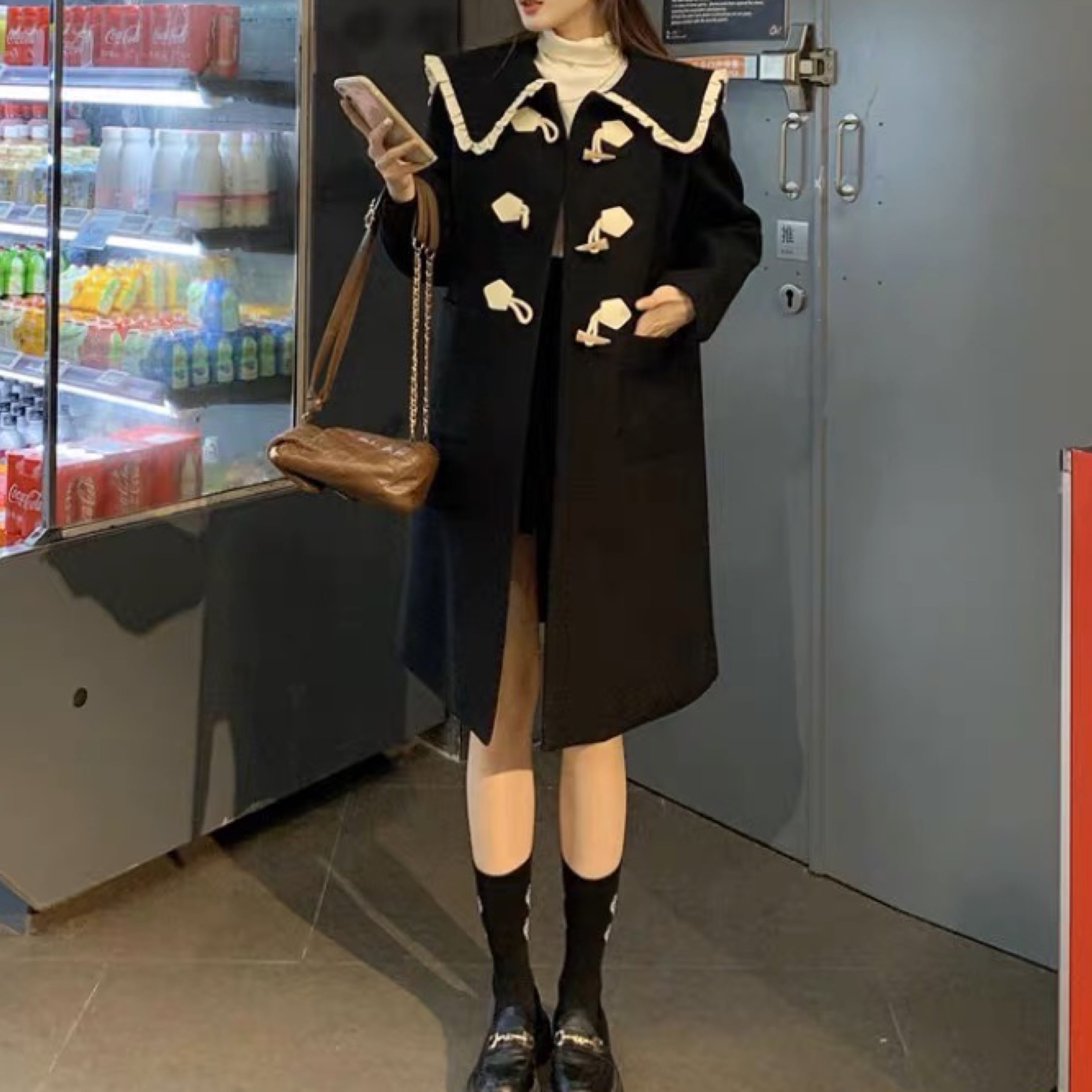 ruffle collar duffle coat(black / white) A0111