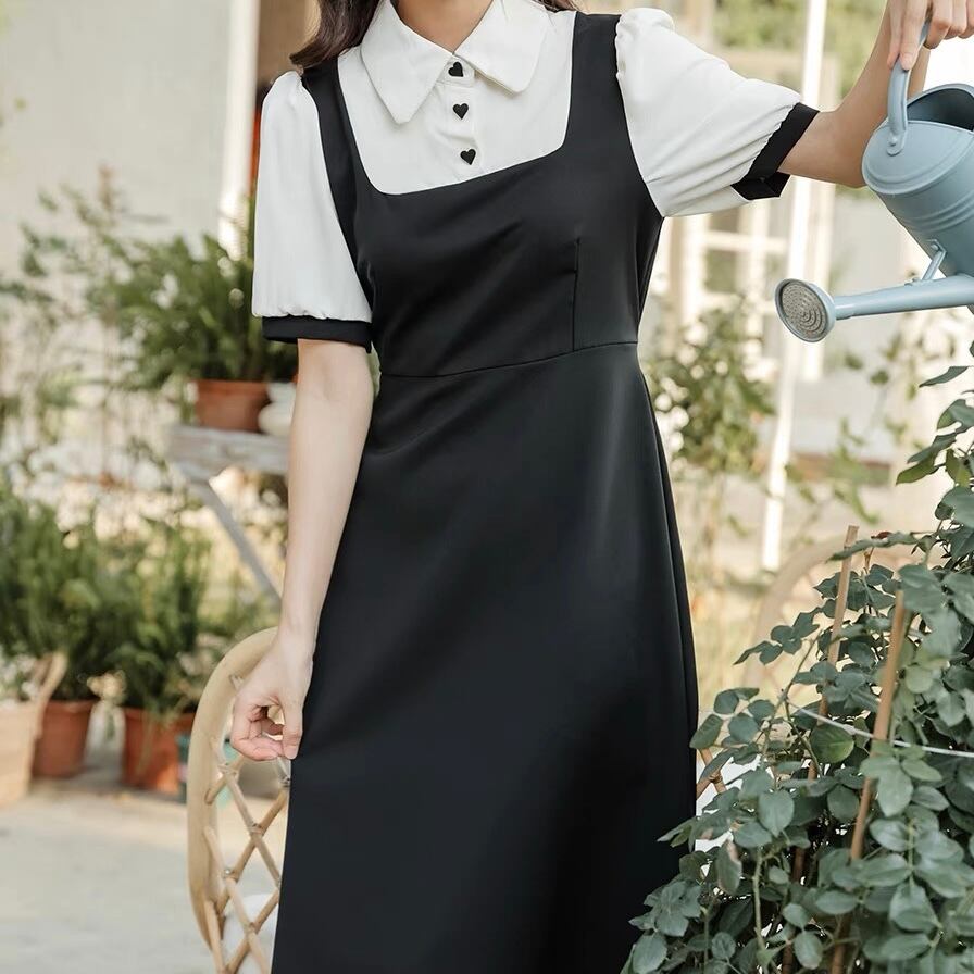 ハートボタンが可愛らしい、ミモレ丈のドッキング半袖ワンピース♡