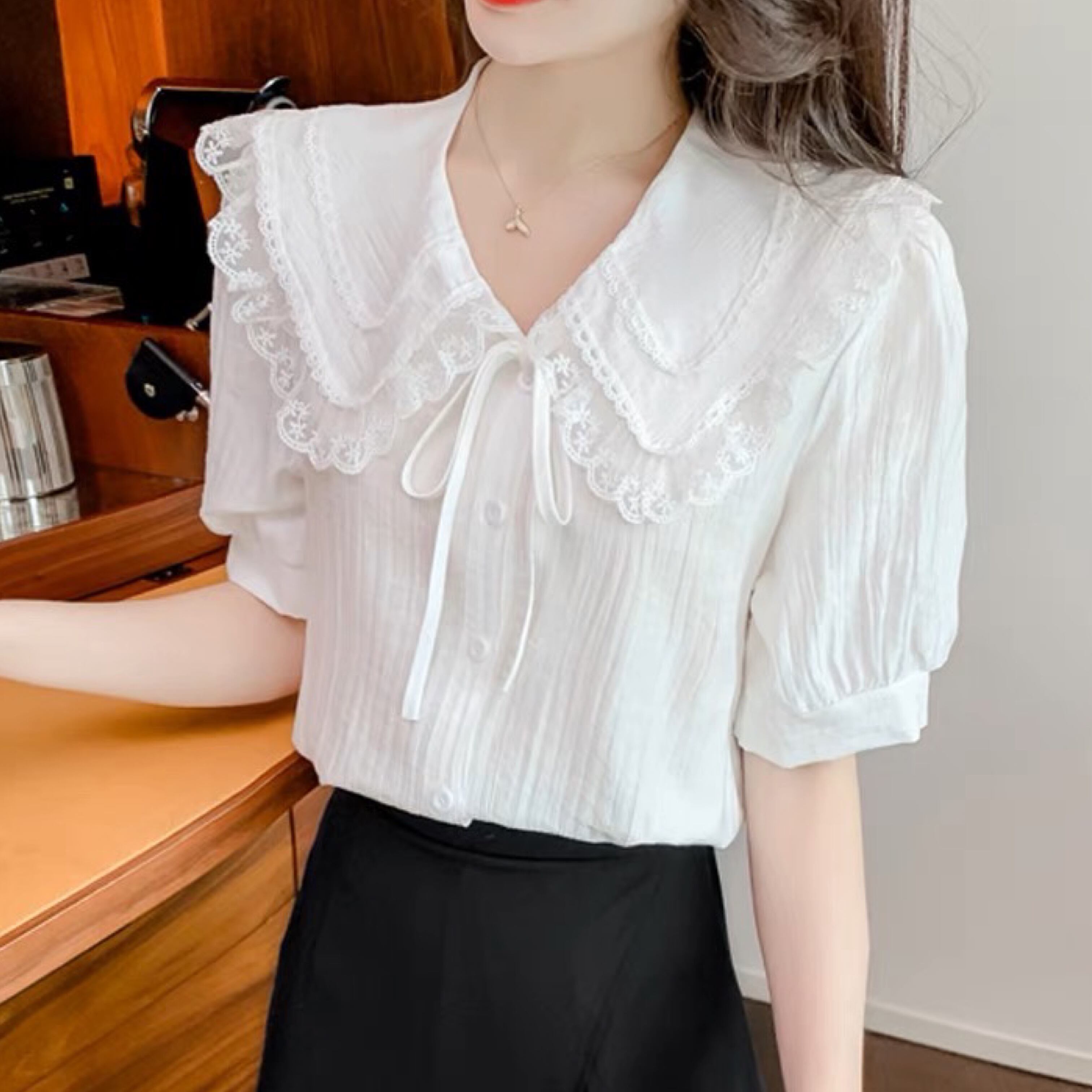 double lace collar puff sleeve blouse A0203