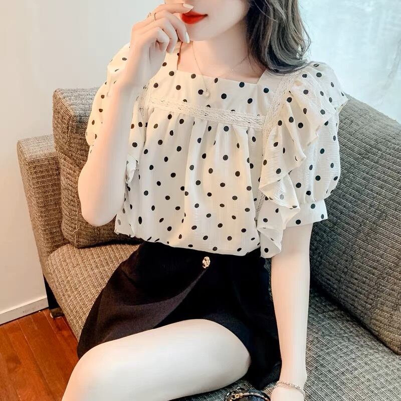 肩フリルとスクエアカラーが特徴のドット柄半袖ブラウス♡